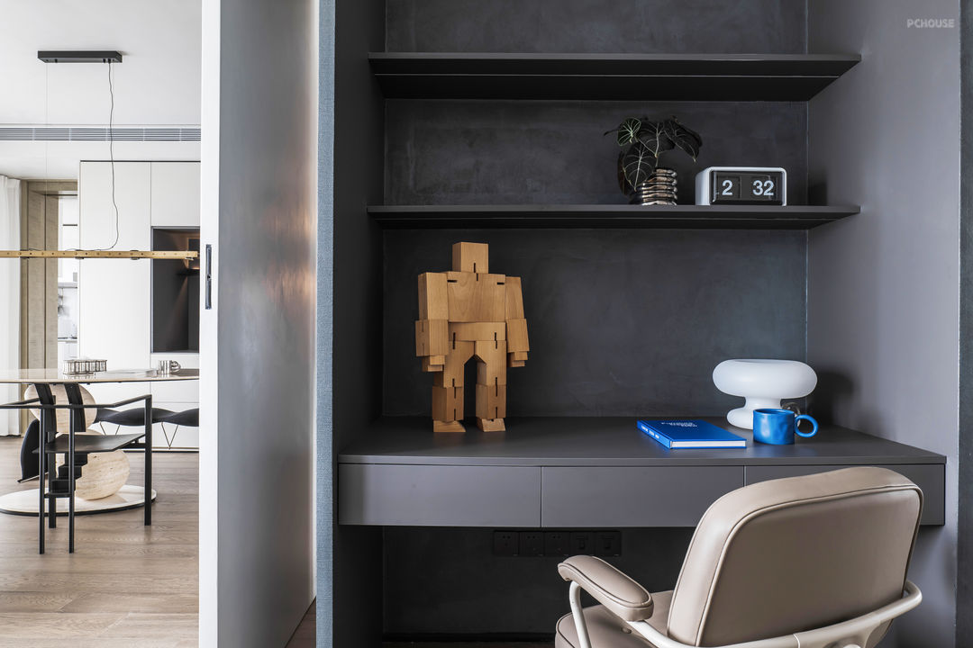 洄游动线有一个很好的作用就是可以通过不同的路线,不需要折回,就可以到达想要去的目的地。把书房多余墙体拆除,用中轴门做替代,以书房的两扇中轴门为中心,环绕书房,客餐厅、玄关与其形成了一个洄游动线,使整个动线更加舒适合理。开放了空间,自然光引入,整个公共空间的光感互通,达到了一个绝佳的视觉效果。洄游动线的设计初衷是以人为本,结合业主的实际生活动线习惯与需求,在满足这些的同时兼备美观大气的设计。