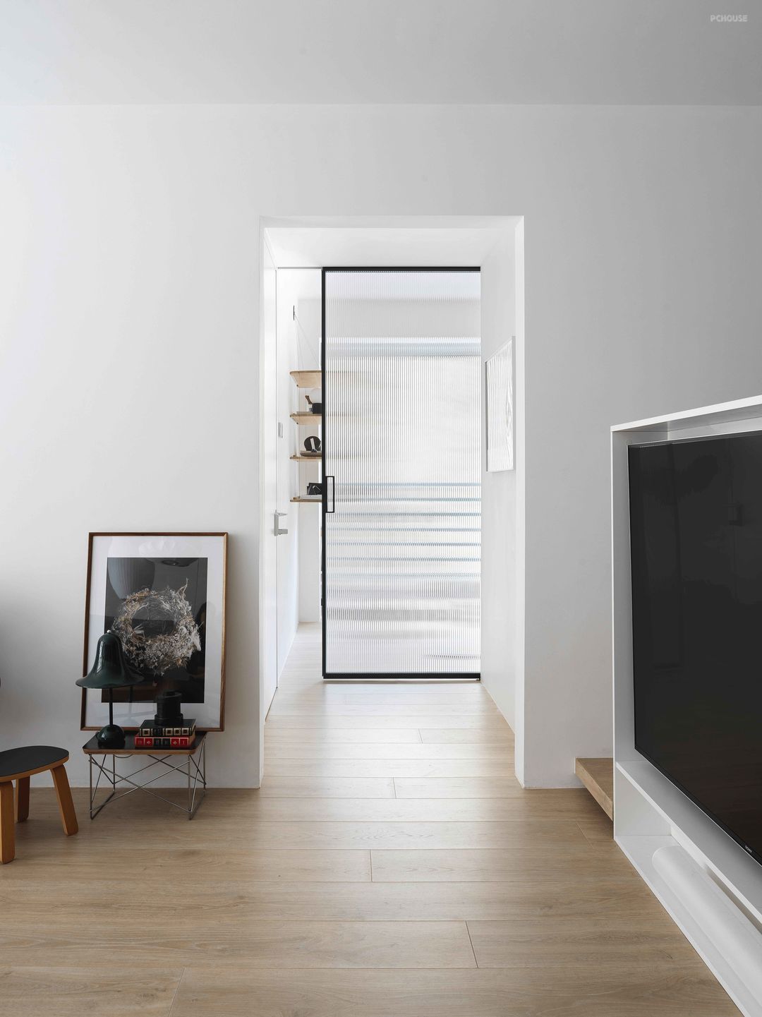 通往次卧的门改成长虹玻璃移门,与步入式衣帽间共用,也能为客厅提供光线。
