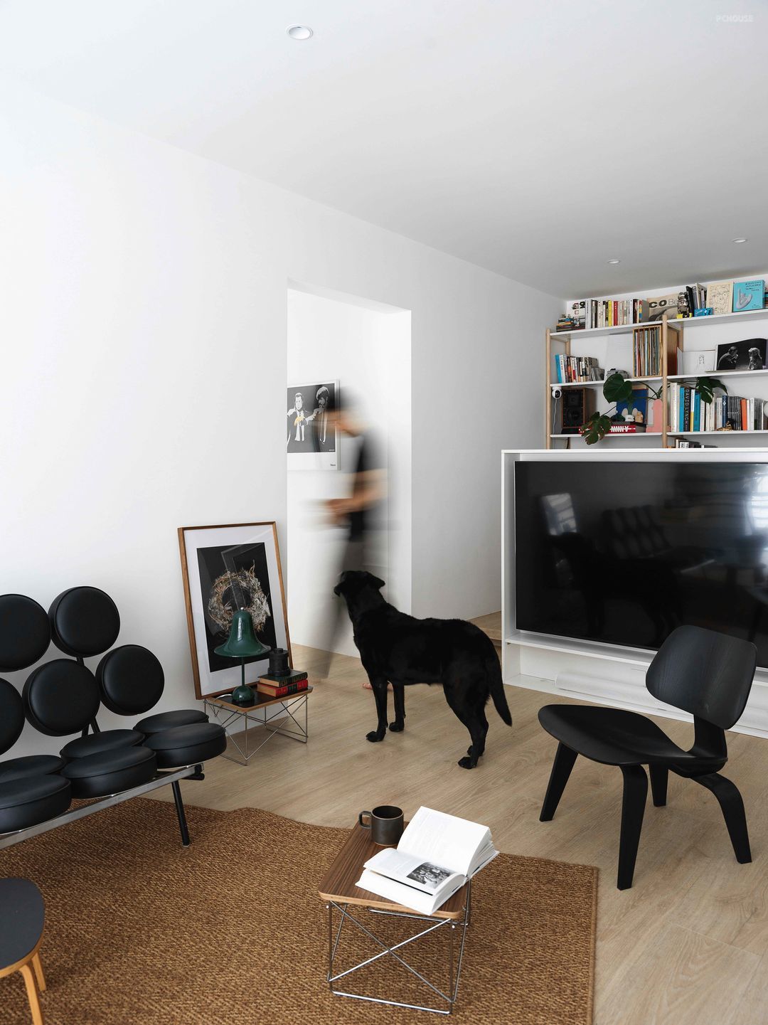 4,中置沙发区域和半高电视墙隔出的阳台和电视后区域成为宠物空间