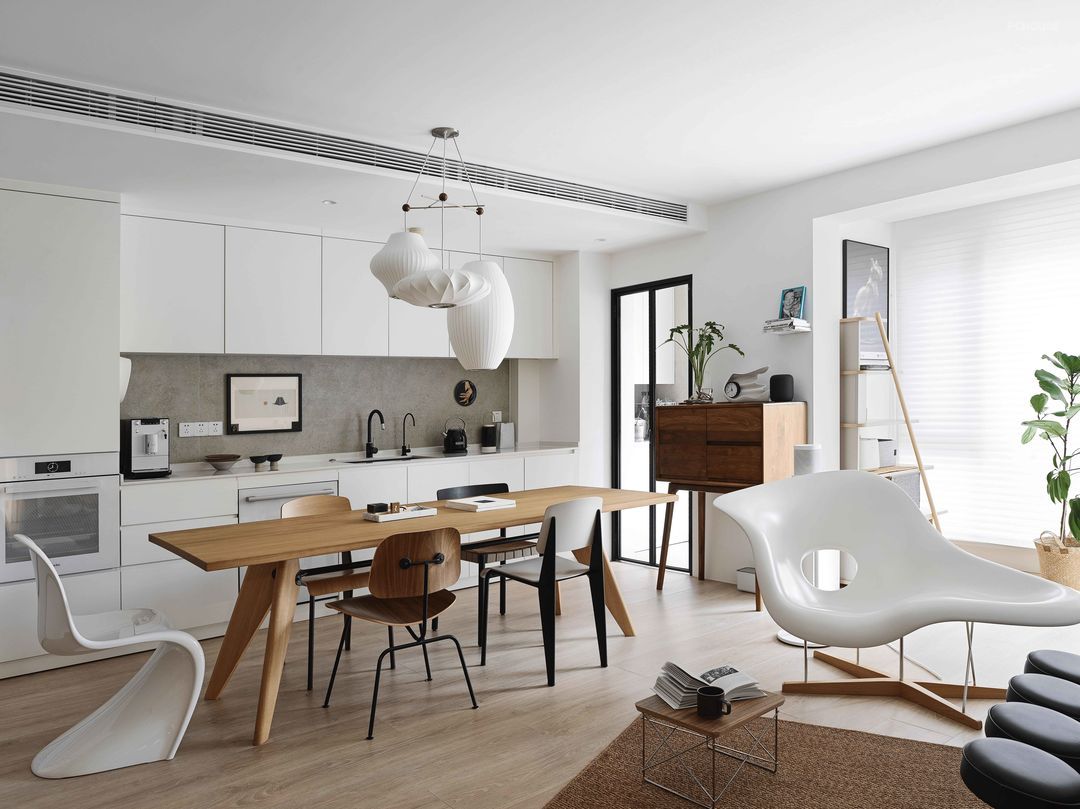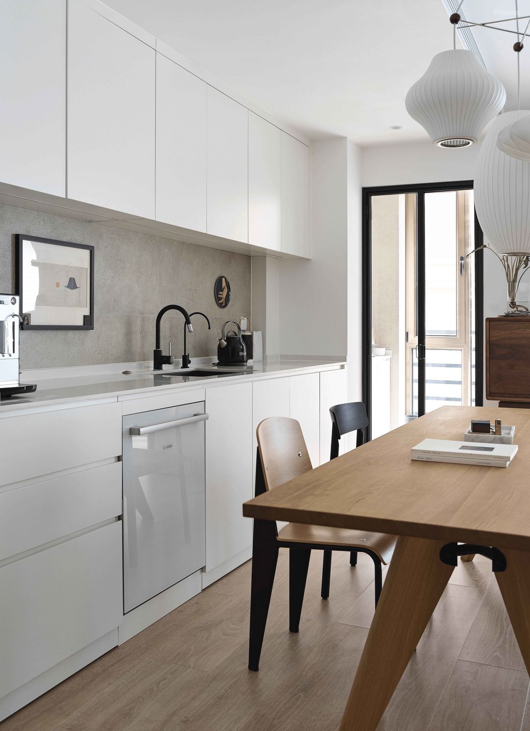 餐厅橱柜采用白色爱格板,造型简约纯粹,退隐成为餐区的“底子”,冰箱,烤箱,洗碗机等厨房电器嵌入其中,一应俱全。