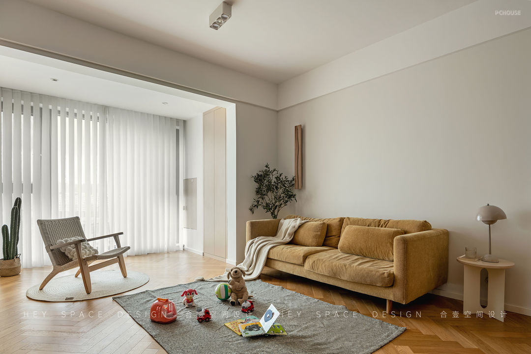 @合壹空间设计:整个客厅的色彩温暖明亮,温润的木地板契合于此的恬静,梦幻帘过滤的光线柔和,营造出温柔细腻的氛围感。