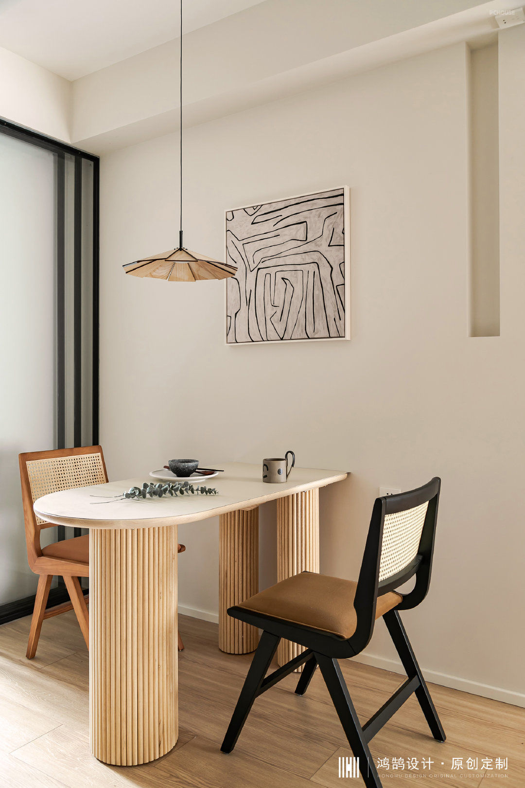 餐厅墙面预留了长条灯槽,用作氛围光源补足,并选择一组伞形吊灯,为自带弧形的餐桌遮挡风雨,只要坐下来就感觉身心平静。