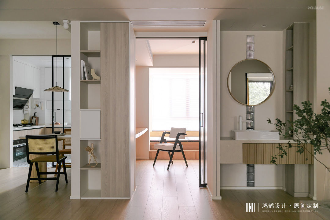 书房右侧设计了卫生间干区,使用透光玻璃砖、石膏板隔墙、圆镜组合,实用率高且美观。
