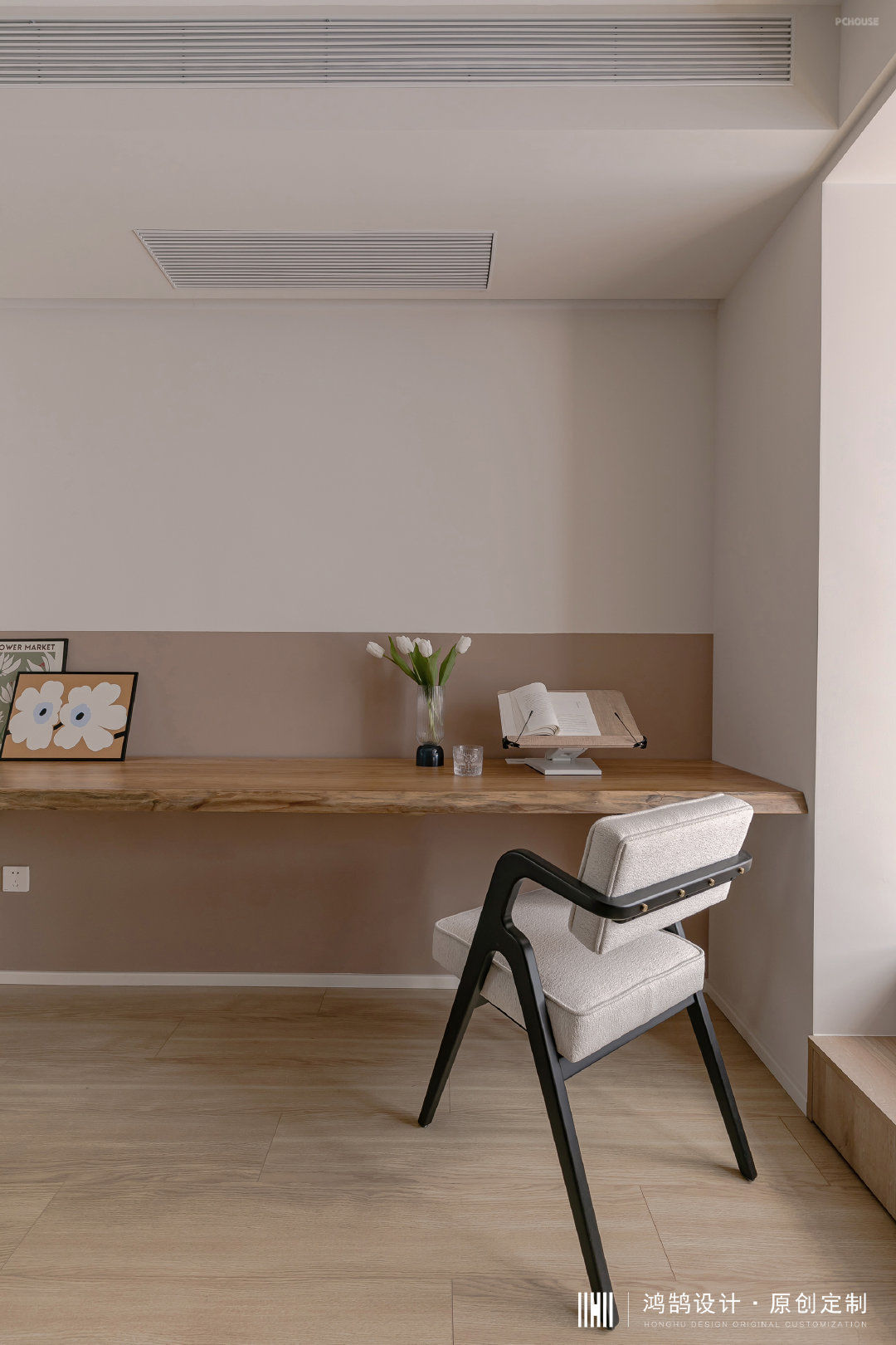 半墙的乳胶漆墙面拼接处理,分割出墙面的层次感,中央空调吊顶内侧设置了一组反光灯槽,补足光源的情况下也相当的简洁。