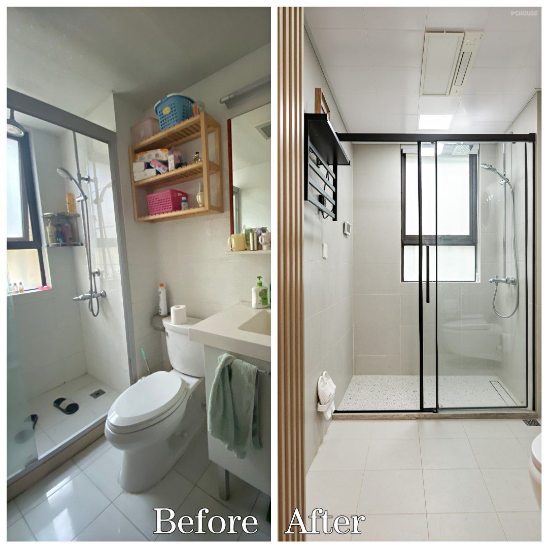 卫生间湿区,延续了客餐厅的风格,墙地面都选用了白色的瓷砖,搭配黑色窄边框的淋浴房和毛巾架,整个空间干净整洁又好打理。