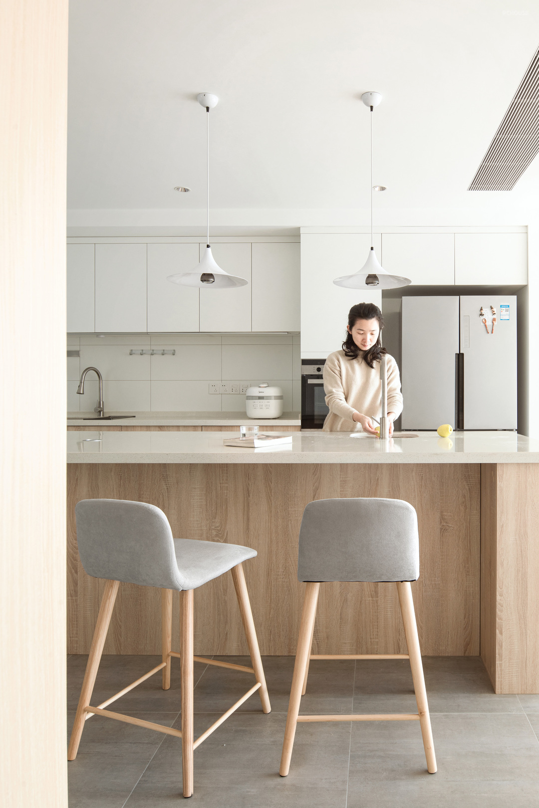 关于整体方案:基于空间中丰富的元素,大面积落地窗、开放式厨房、柜子的秩序感、空间的有动感等等,而选择在造型上做减法,突出屋主想要的自由、大而不空、富足的空间生活状态。