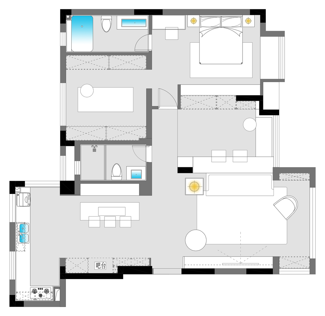 本案为小两口居住,所以我们在结构改造上没有太大的局限,全部按照本案年轻人的生活方式来规划。餐厅借用了次卫生间的共墙,留出更多的空间给餐厅的储物,同时让餐厨动线更合理。客厅墙垛敲掉,让客餐厅更整体,采光更通透。为扩大客厅视觉与书房通透感,我们将书房多余墙体全部敲掉,开放式书房独立又方便。一进门就感觉客厅的空间感。原有次卧直接纳入主卧,作为独立衣帽间,平时屋主还能在里面健身练瑜伽。
