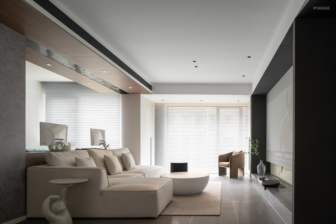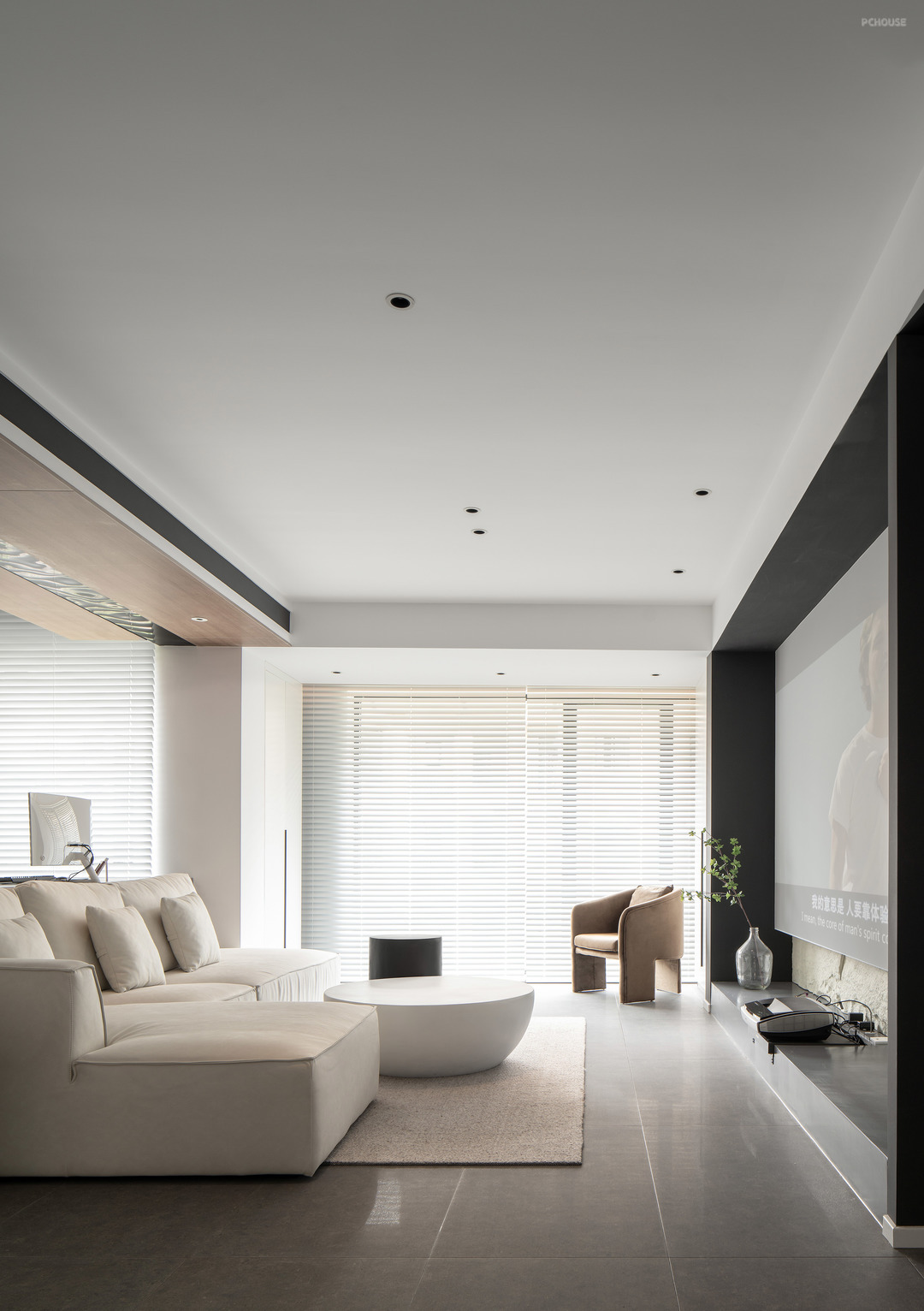 敲掉原始客厅墙垛,自然光线更多的照顾到室内。百叶窗帘没有传统窗帘的厚重感,简约并能够毫无保留的让自然光投射进来。落地窗极简的边框不遮挡视线,窗外的风景尽收眼底。