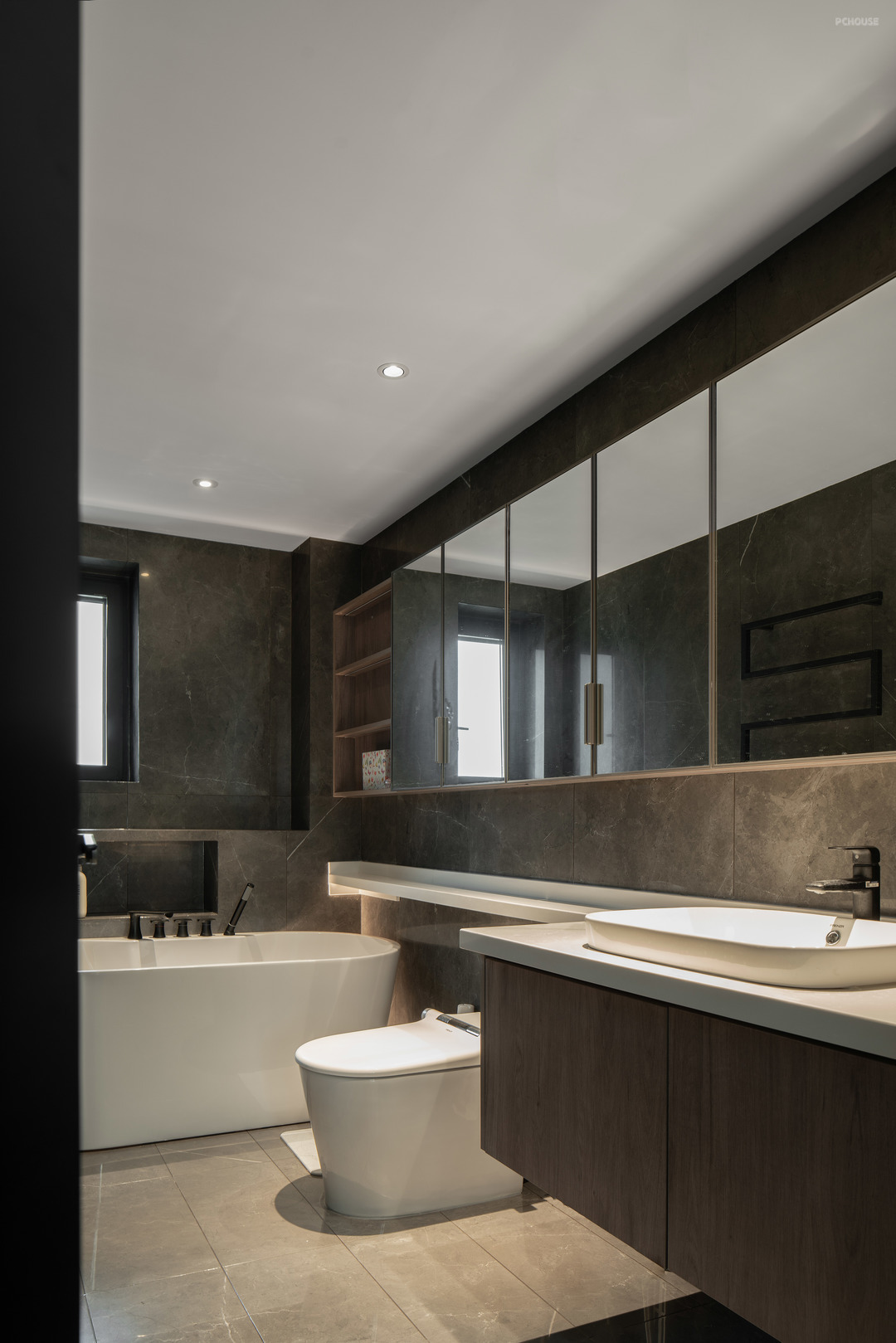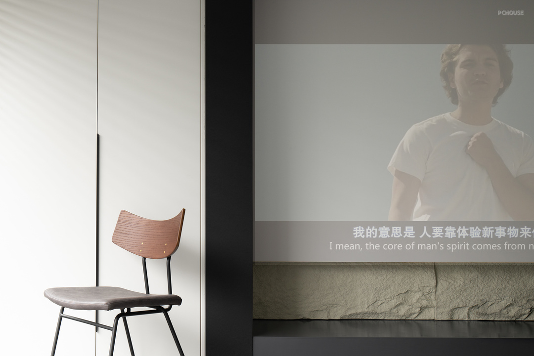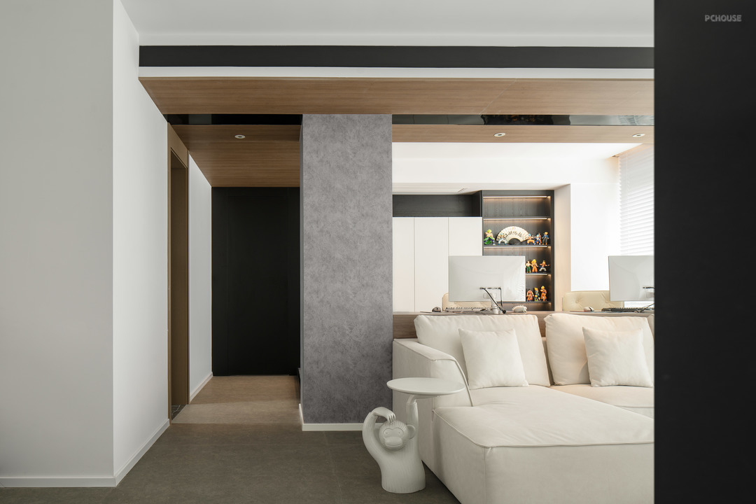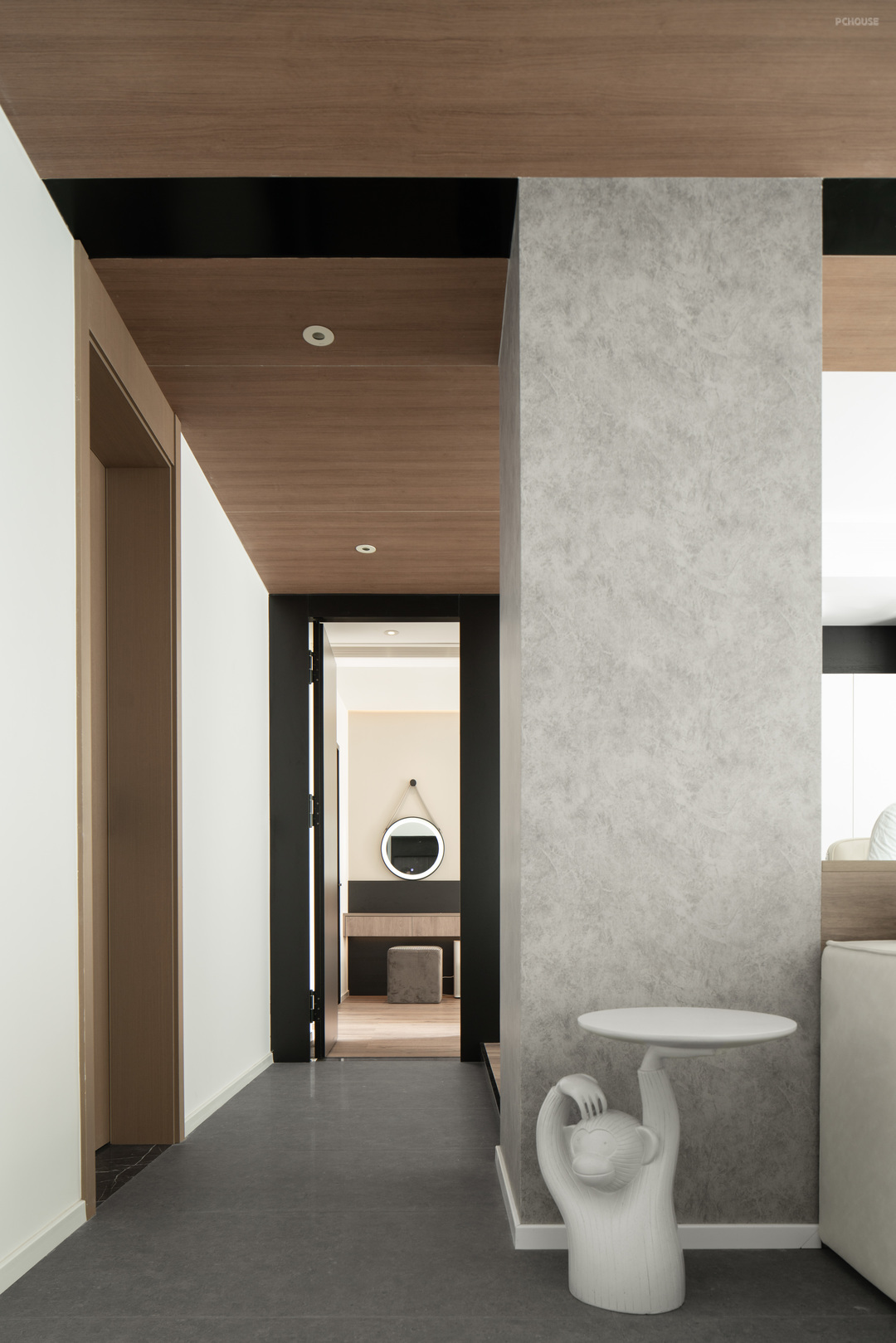 主卧入户,用隐形门来开启。增加了一份神秘感,也让书房的柜体与门形成了呼应,保证了整体性与美观