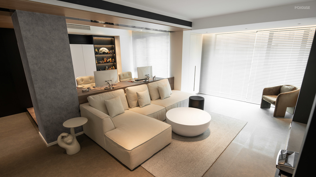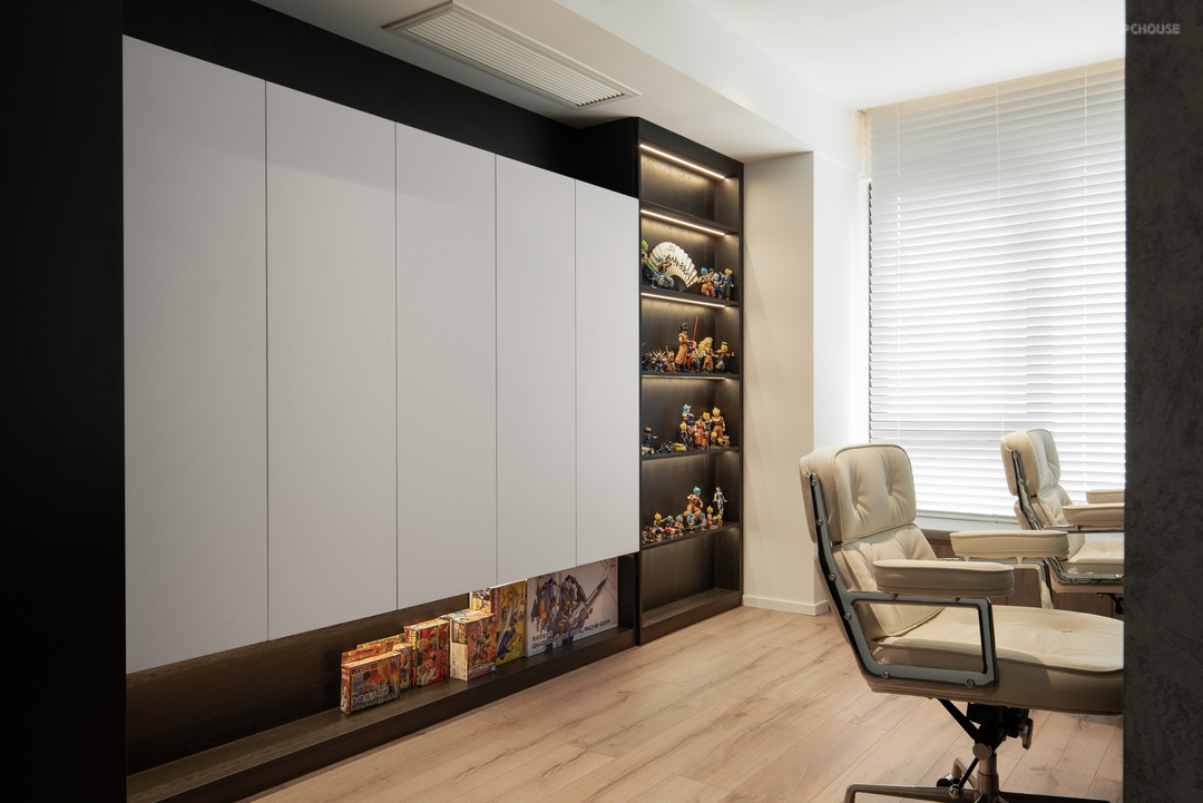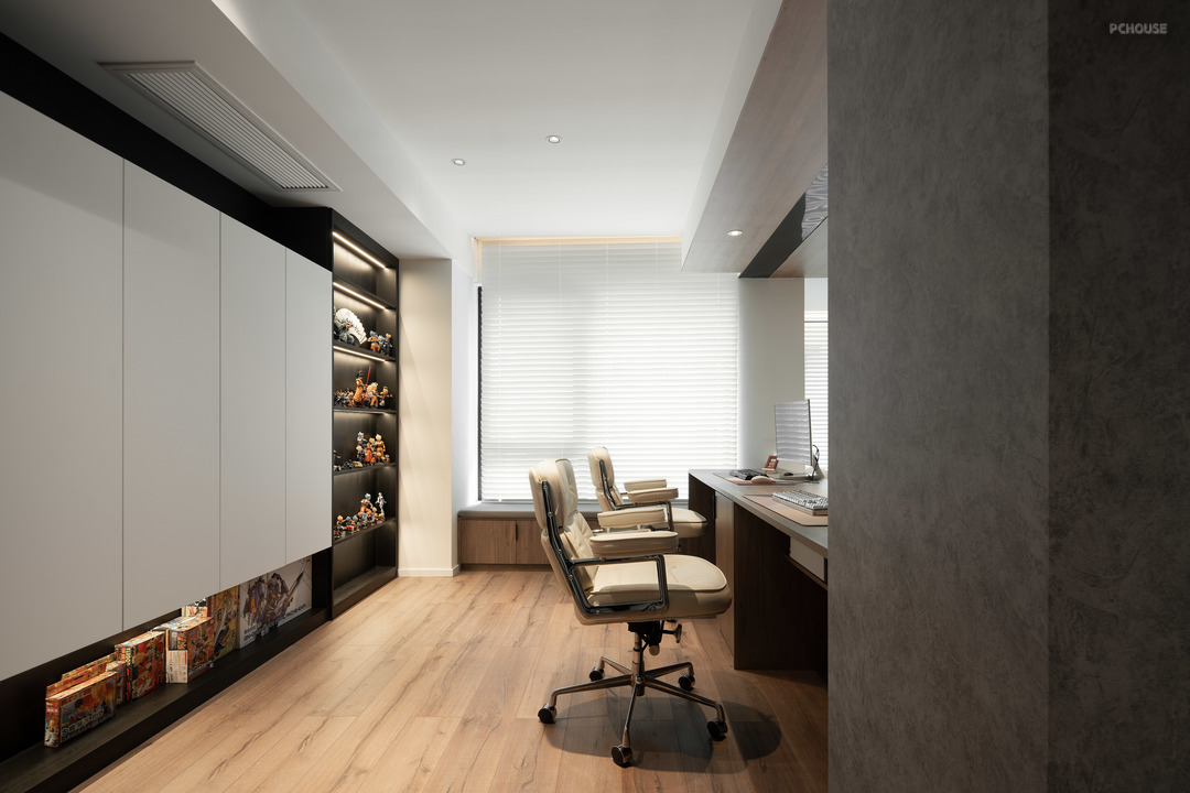 开放式书房是屋主通往主卧的秘密花园,也是办公娱乐的乐园。能与家人很好的互动也将客厅放大了一倍。