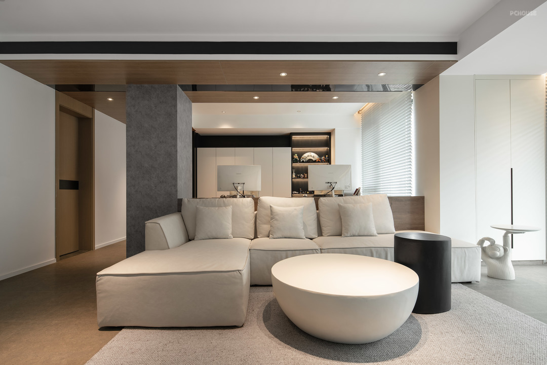 布艺沙发、石材、水泥灰地砖、木质吊顶的结合,让硬朗的空间多了一份柔美与自然的气息。