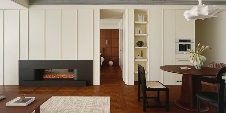 客厅开放式布局,沙发的摆放形式也是会客的形式,电视背景墙做了大量的收纳区域,现场制作的柜子收口更加贴合。