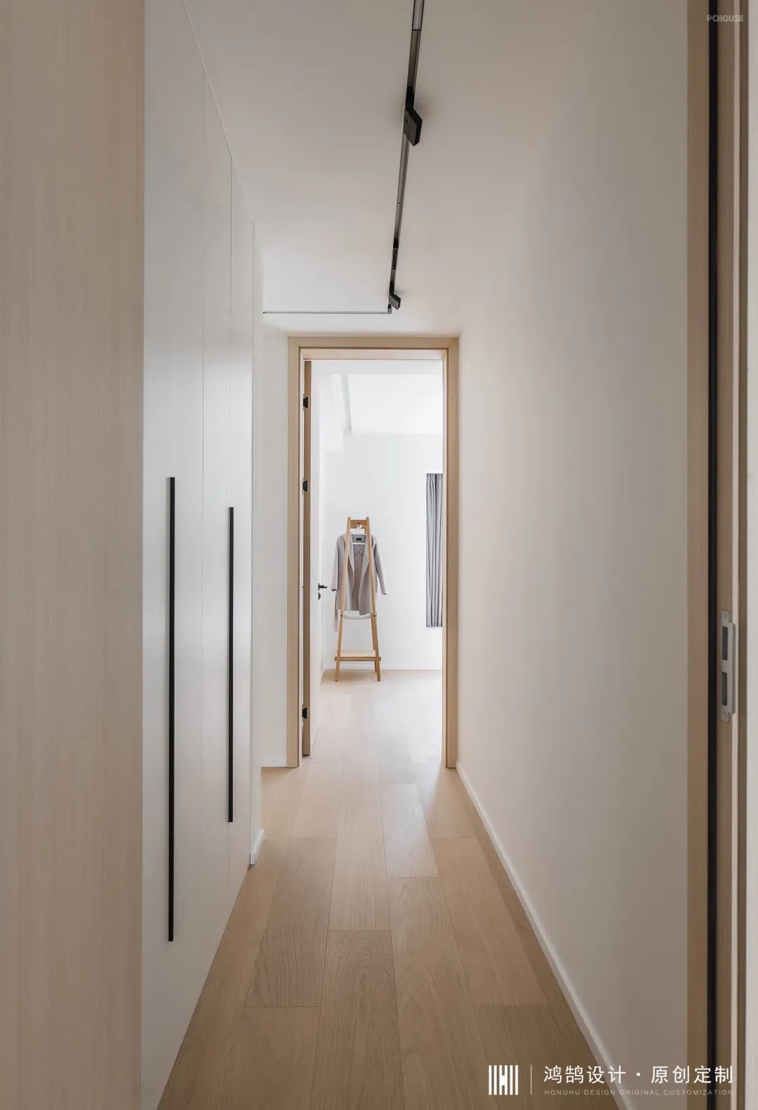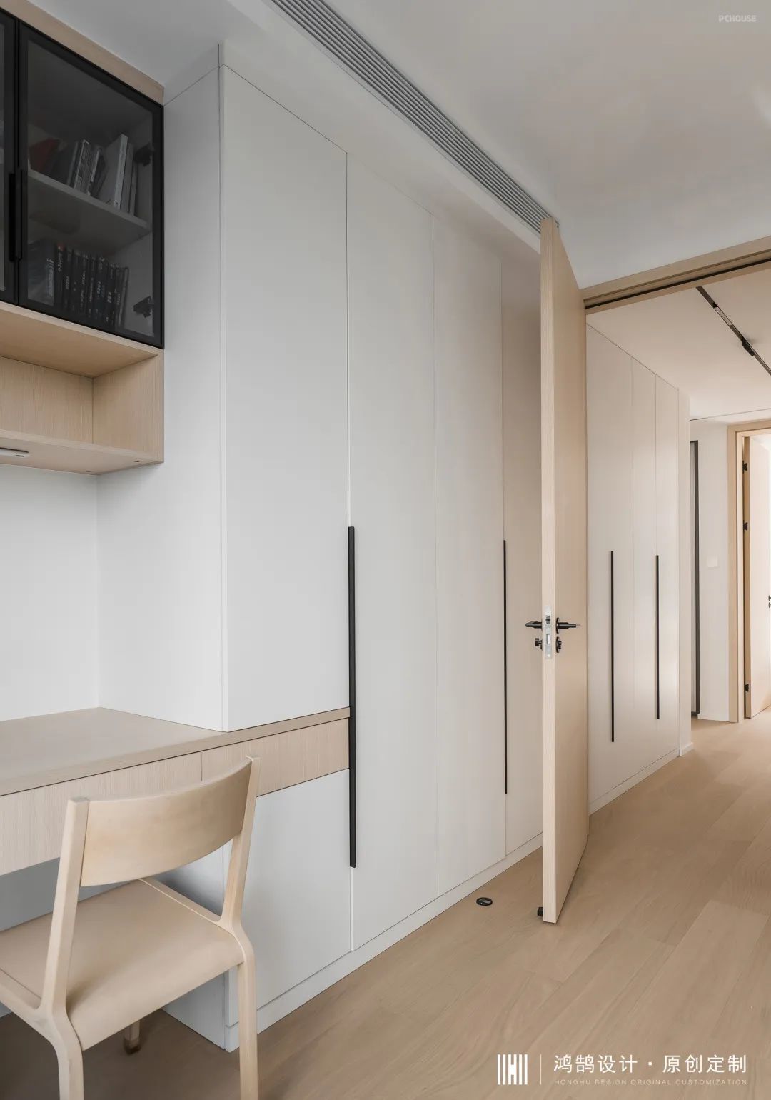 整个公共区域的收纳功能集中在了书房一侧墙面,依次排布玻璃书柜、衣柜、展示柜分段式设计,通过材质造型的变化带来墙面的层次感,通顶的定制柜体十分简洁耐看,与纯白的极简顶面严丝合缝地嵌在了一起。
