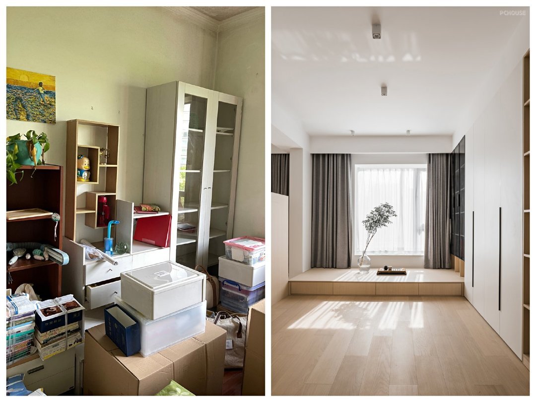 木色继续向空间延伸,阳光洒落透过窗帘遮掩映出斑驳的光影,这种舒适的材质与光线,成就了女主人最喜爱的日常阅读冥想空间。我们将地面抬高形成榻榻米区域,底部规划抽屉柜兼顾储物。