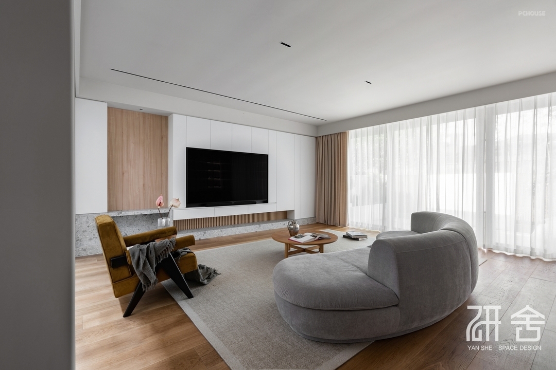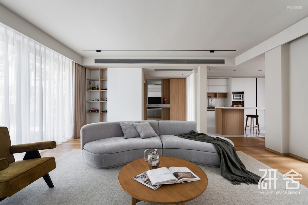 灰白调搭配原本风,巨幅的地毯,从视觉上给人营造一种与自然相融合的静溢感,禅意无穷的装饰有种“谦谦君子,温润如玉”既视感。