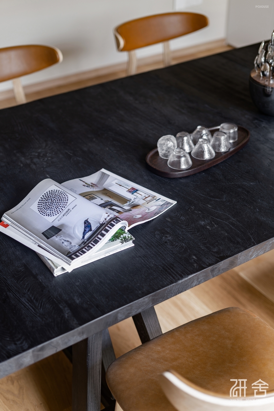 看似突兀的黑色餐桌,实则不然。通过做旧工艺和艺术的造型,恰好是整个空间的点睛之笔。搭配原木风的地板,让人不由自主的喊出那句“じゃ、いただきます”“那我就开动了哟”,黑色的餐桌对应着透明的玻璃酒柜,在视觉上将酒柜做了一个延伸感,犹如置身在松冈锭司的“深夜食堂”中。