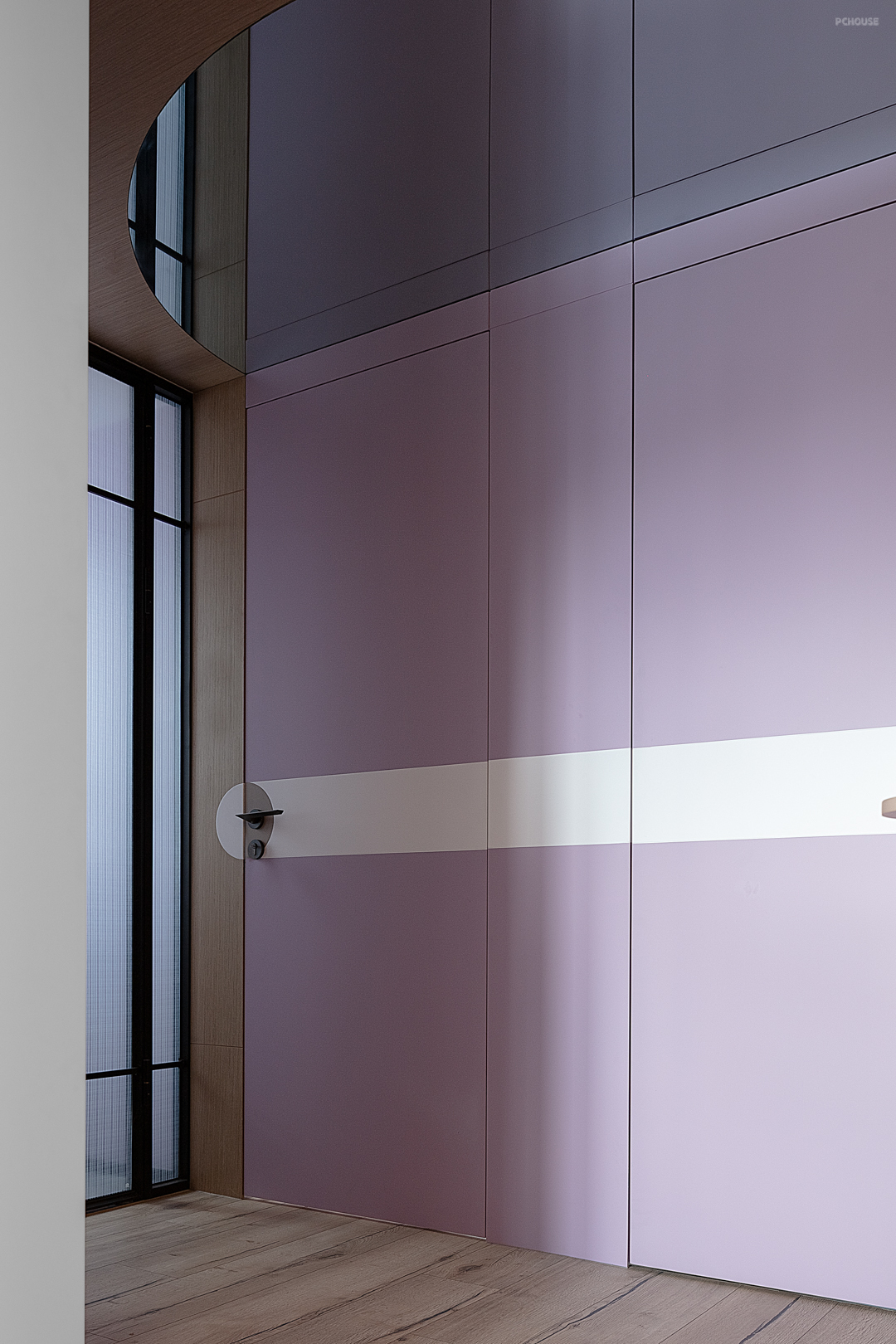 合理运用面积,提高空间利用率,是本案不变的主题。靠近主卧的这面墙,我们规划了小朋友涂鸦的墙面+极简风的储物柜,隐形门让整体更统一美观。