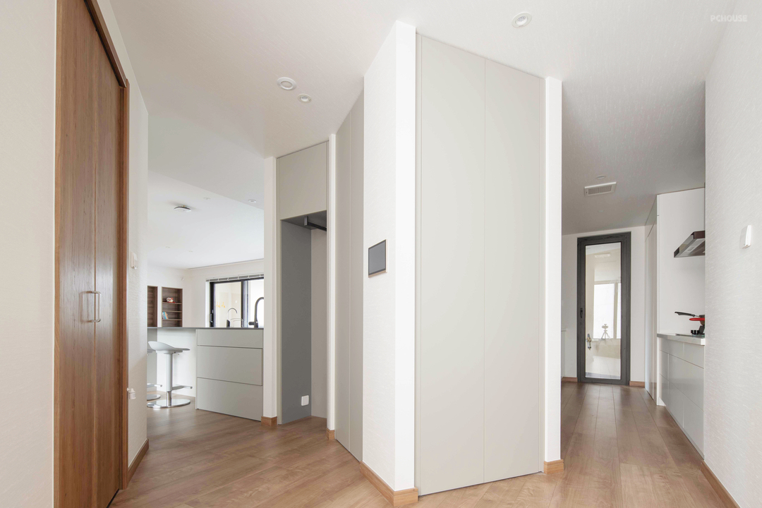 玄关进去左手边的通道设置钻石型的杂物间,户外用品等物也有了藏身之所。