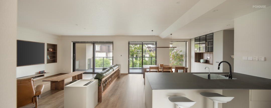 餐桌背部的岛台在台盆上搭载自动感应直饮水装置,并安置两根设计感吧台凳,闲时与朋友坐在此处聊天,还是从后面的书房区域都非常便利。