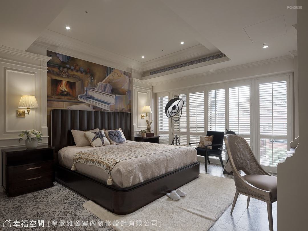 长年在国外生活的一家人,很享受拥有壁炉的感觉,设计团队因此在开门的正中间规划了真的壁炉,以此代表着精神堡垒的象征,也让整体空间气氛更温暖休闲且也更纯正。在地坪铺排上,参考了电影《大亨小传》的感觉,选择仿大理石纹地砖,营造时尚复古且奢华的风情。因为这次主题是“信仰”,除了壁画之外,更将欧洲教堂的概念的穹顶壁画设计带入居家空间里。汪忠锭设计师将穹顶做成长方形,不仅保留客厅3米1的高度,又能闪过梁柱,延伸到电视墙上方时,以弧形修饰,视觉上仍可感受到其高耸气势。来到客餐厅的交界也有一大梁,透过圆拱造型包覆,形成客餐厅的区隔,再来搭配真假梁错觉设计,整合了管线配置,并以波浪状弧形线条拉高空间,营造欧洲石造古堡建筑之感,辅以墙面仿旧斑驳质感的手作艺术,烘托出犹如置身古堡酒窖用餐的氛围。