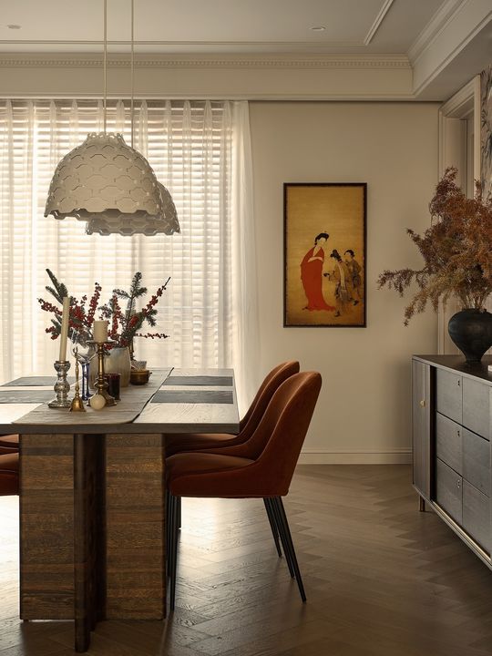 吧台的木质开放架展示着屋主收藏的瓷器,轻盈的透明亚克力吧椅和岩板台面撞击出古典与现代相交融的美与雅。意大利进口品牌SMEG的厨房电器不愧是颜控的不二之选。