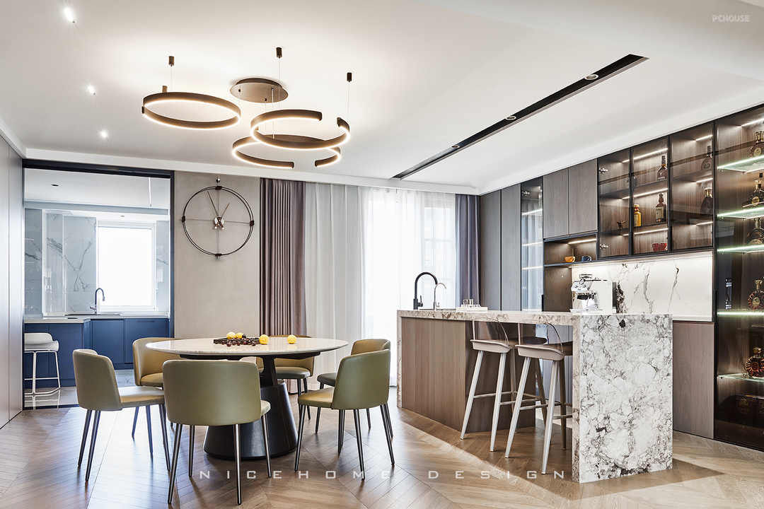 简约的圆桌餐厅与精致的西厨布置,塑造人间烟火与岁月时光交融的艺术美,开放式行为模式也为家人间的互动创造更多可能。