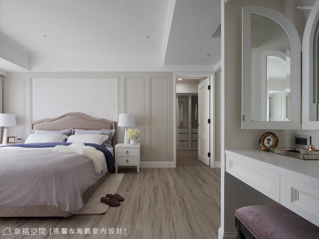 张馨&瀚观室内设计从屋主一家的需求,逐步推敲出每间卧房的廓形,经由矫正入口动线及隔间墙位置,不只赋予两间女儿房完整的更衣机能,也为主卧增加梳妆区域。至于各自的风格喜好,则借由不同饰板、色彩及造型渲染空间氛围,将典雅的美式格调、自由不羁的Boho style,以及温雅甜润的手绘风场景一一映现。