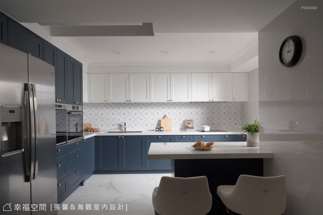 延续书房的活泼调性,乡村质感的厨具与简约雅致的小花砖,以蓝白分明的跳色设计串织整个厨房空间,为喜爱烹饪做甜品的女主人,精筑一处轻松悠闲的厨艺坊。沿着窗边延伸出的中岛吧台,将电器柜、碗盘收纳裹藏于下方,而桌台大尺度的面宽,更厚载了制煮香醇咖啡、准备面包小点、享用轻食早餐等日常情境。