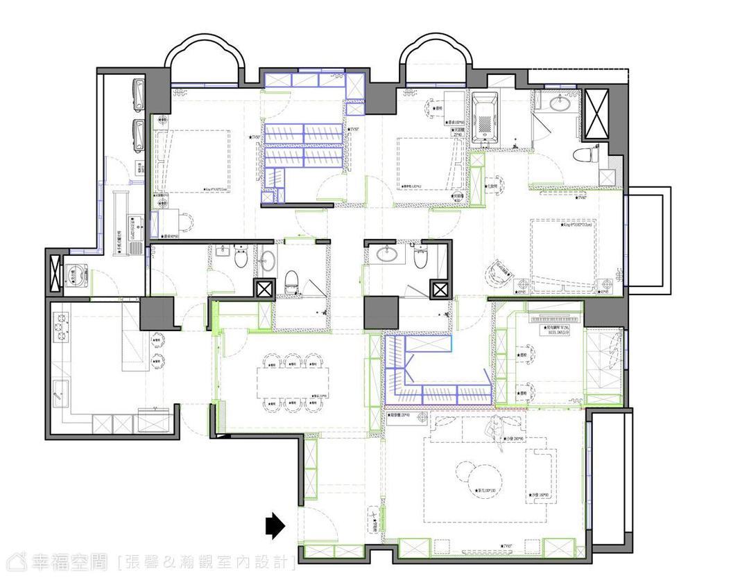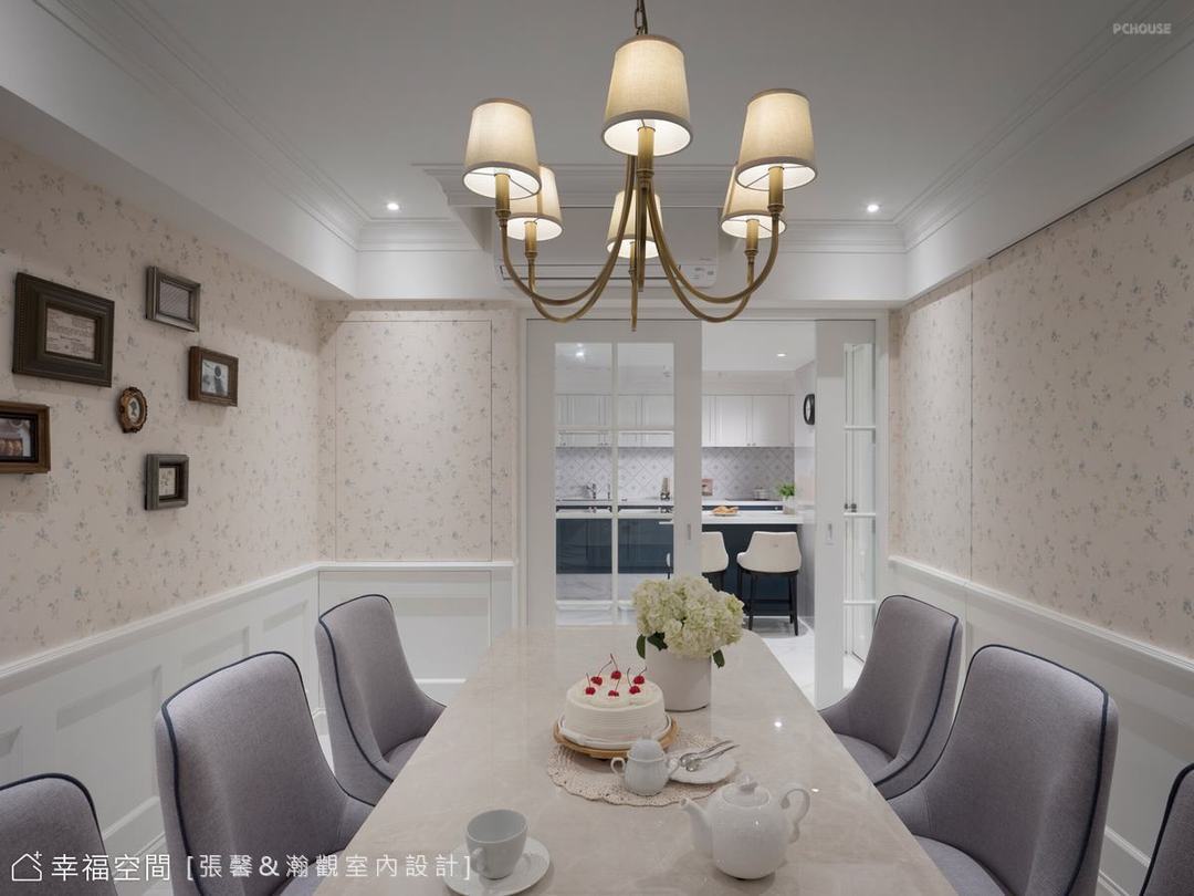 淡雅柔美的藤色作为空间叙事的起点,美学触角从玄关连绵至客厅,再藉同色系的花样壁纸妆点餐厅,成功在场域与画面感之间创造紧密的视觉联系,奠定交流互动的轴心。客厅引入煦煦日光,在百叶窗、线板、金色框线及典雅家具润饰下,韬韫出温甜稳敛的美式基底。推开沙发背墙旁的玻璃格门,书房的风格定调幡然一转,空间以鲜明大胆的霾雾蓝展现另一种美式风情。此外,设计师巧用上下分段的巧思梳理家具配置,在四方的平面向度里植入卧榻、神明桌及钢琴的摆放位置,齐全所有生活的实用机能。