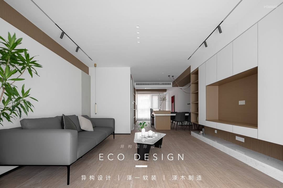 客厅简洁舒适有格调,原木色和纯白色做搭配,原木色质感温润,白色清爽干净。无主灯设计使得空间更为开阔,小户型也值得拥有。定制收纳柜电视背景墙,让空间充分利用。