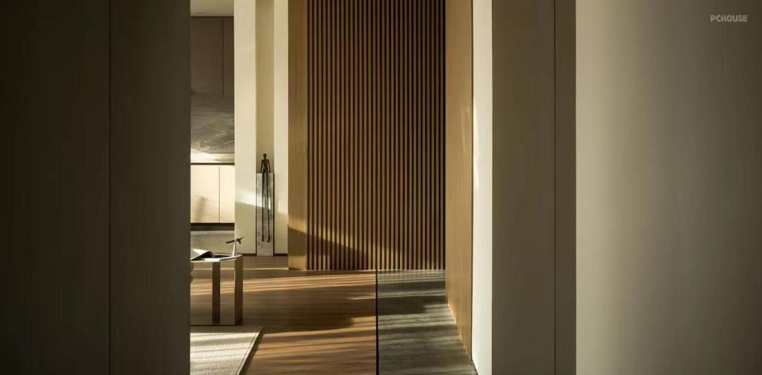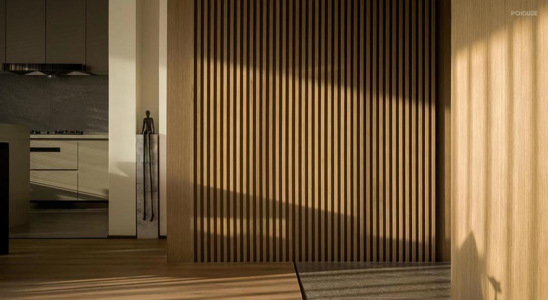 一面木质格栅板自然、趣味性地实现了自玄关到室内的空间过渡,并通过石台端景这一视觉落点与室内空间衔接。自然光渗入裂缝,渲染了木材的质感,书写空间安静、治愈的序章。