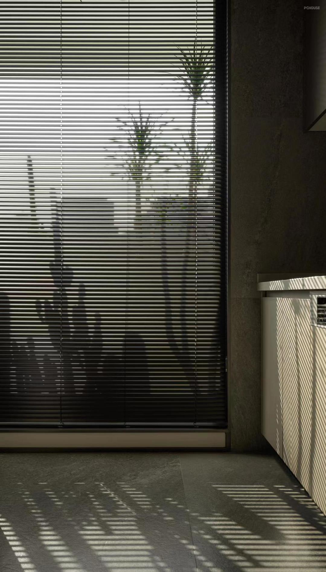 近八米长的阳台给予了空间最大的自由度与可变性。从空间的色彩、材质、留白和墙面的呼吸感等方面着手,塑造更加轻盈的空间体态,让光成为空间情绪的主要载体,在原始木材包裹的客厅里,坐在沙发上放空自己,感受时间的游走,触摸材质的肌理与质感,与午后的阳光浑然一体。光影随着阳台绿植景观与百叶帘的体积感与切割,勾勒出舒适宜人的备餐场域,凝聚成生活细碎角落里的美。