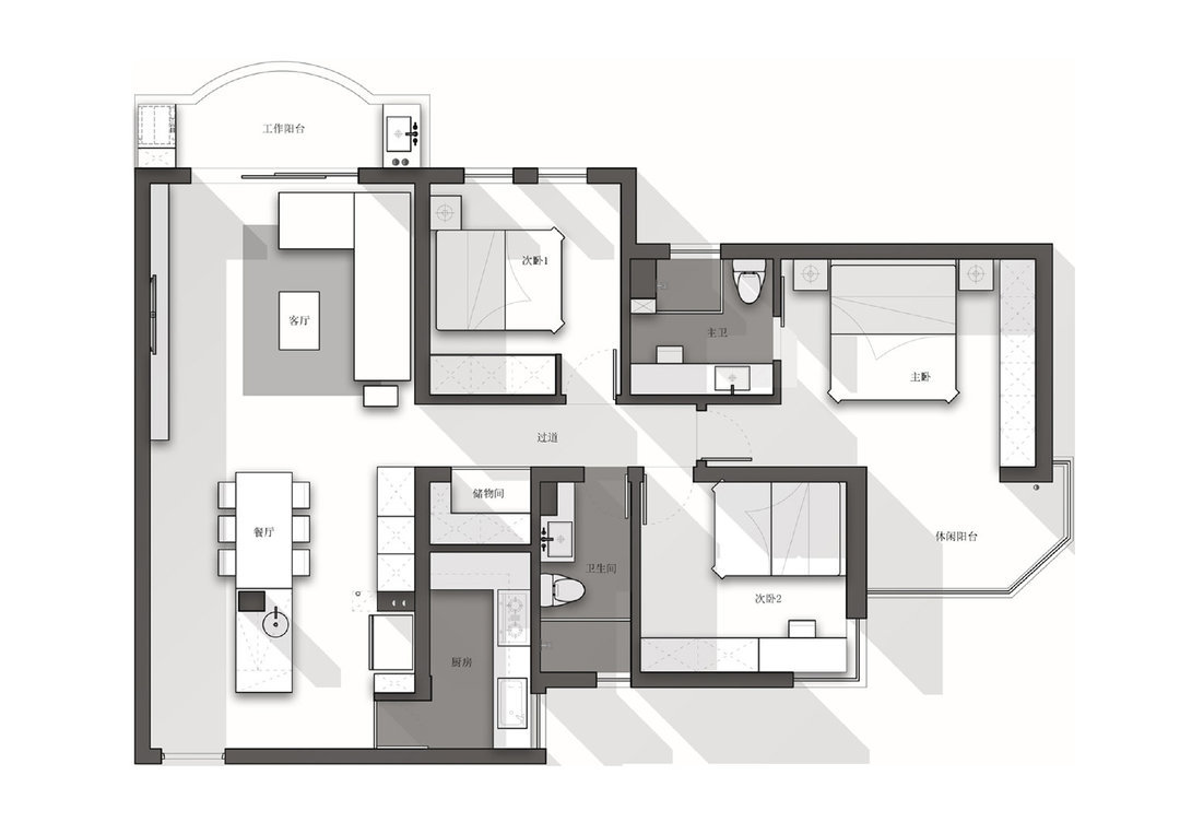 1. 把厨房移到工作阳台,厨房与餐厅打通。父母习惯中式烹饪重油烟,年轻人喜欢西式烘培,餐厅规划西厨区,融合冰箱电器柜;