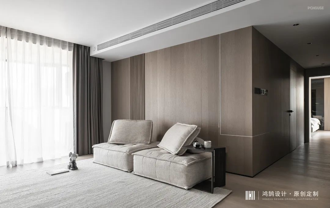 主卧空间采用了借光引景的手法,调整了原有的结构,重新做了排布关系。改变了主卧床的位置方向,可以让主人每天起床时可以看到每天清晨的阳光和外面的景色,每天起床可以有一种很治愈的感受。