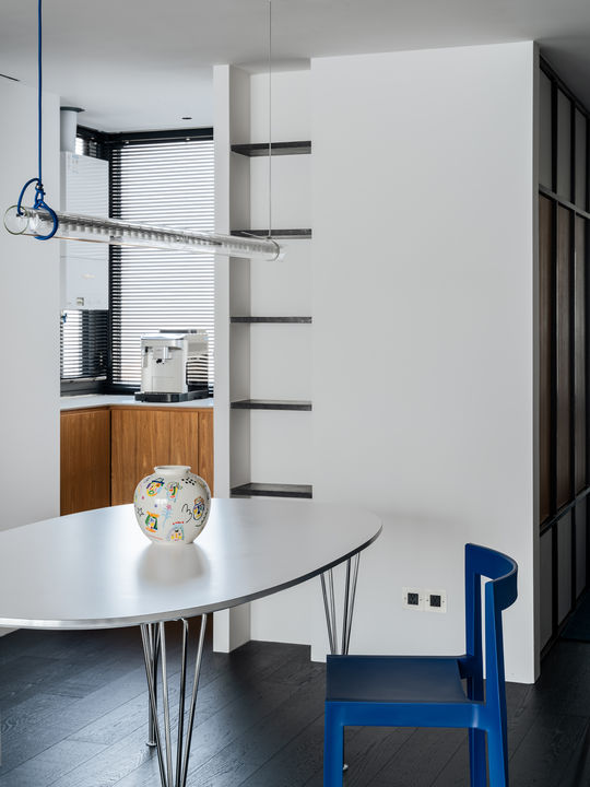 木质餐桌质感温润,布艺椅肌理明晰,立体简洁的线条与材质细节的运用上,让餐厅更具现代感的利落与精致之美。