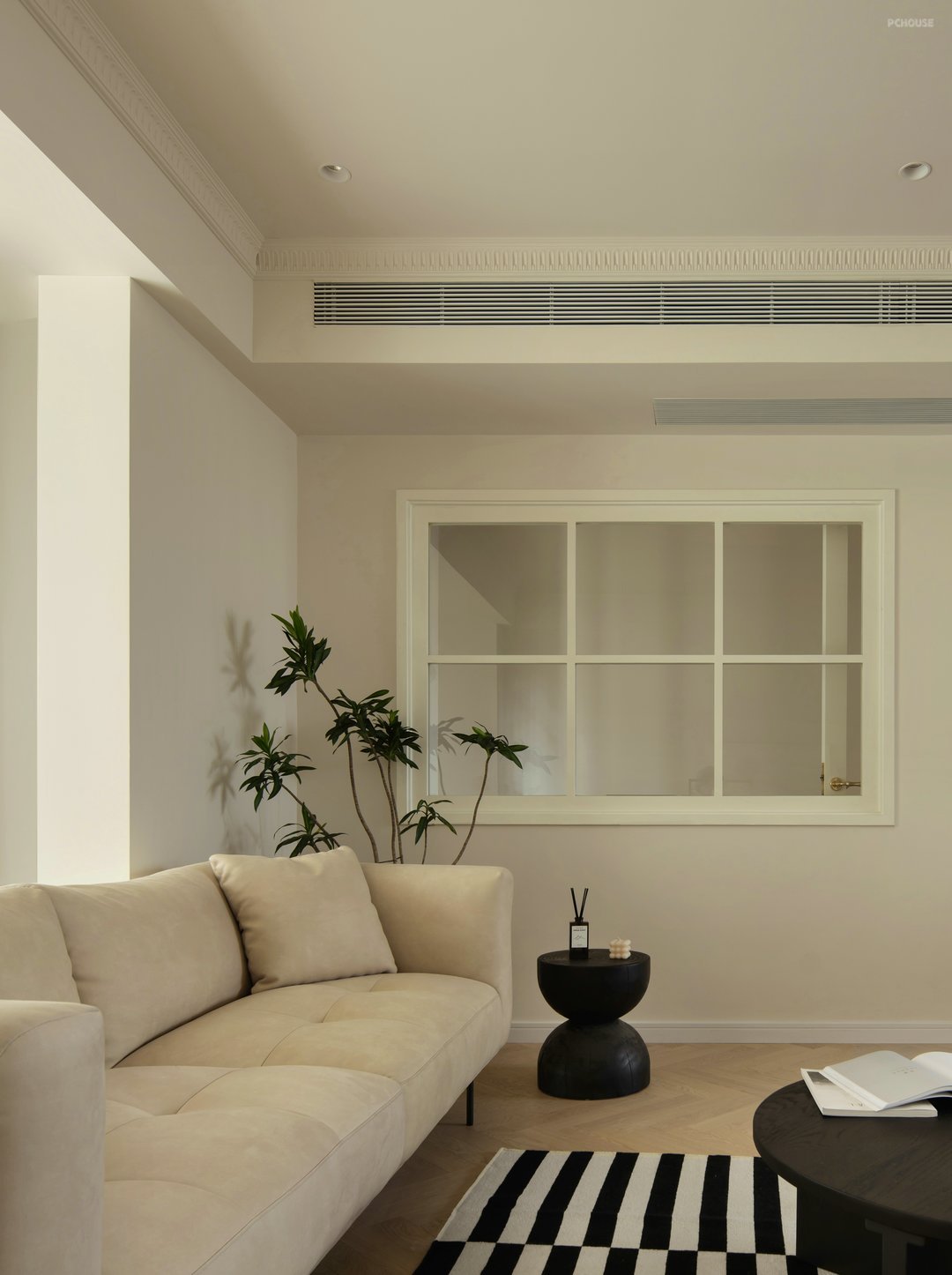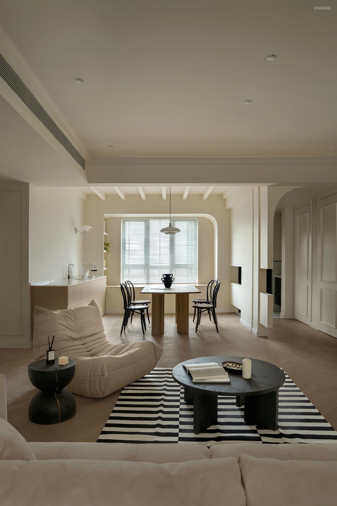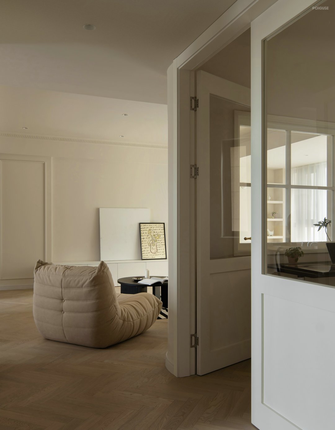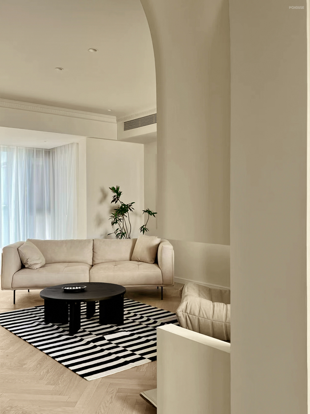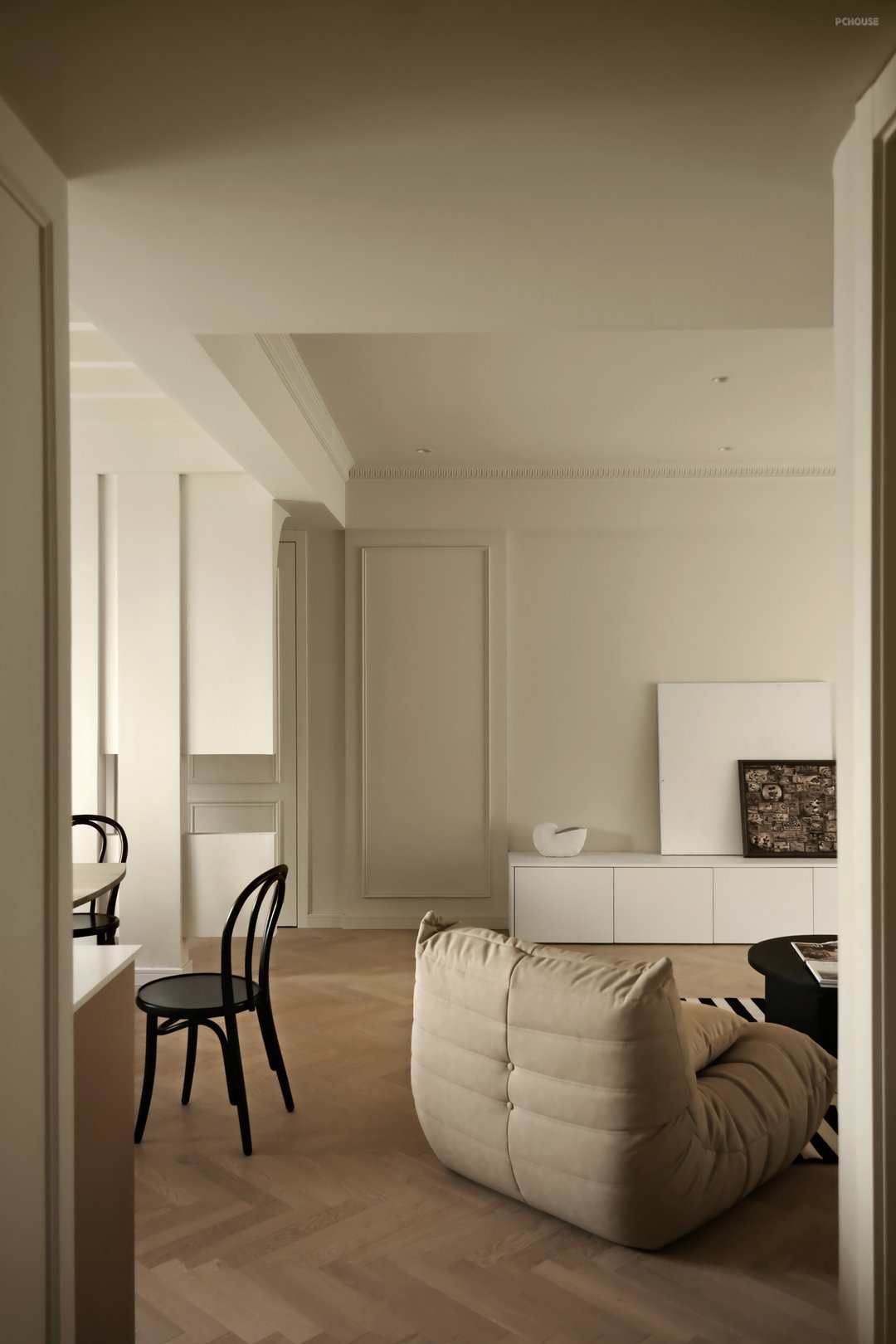 干净柔和的奶油色系墙顶面通刷,拉伸层高也形成更加温柔,木质质感的中古风家具+奶油气泡柔软的沙发,在人字拼地板的映衬下,自然随性,优雅、张弛有度。