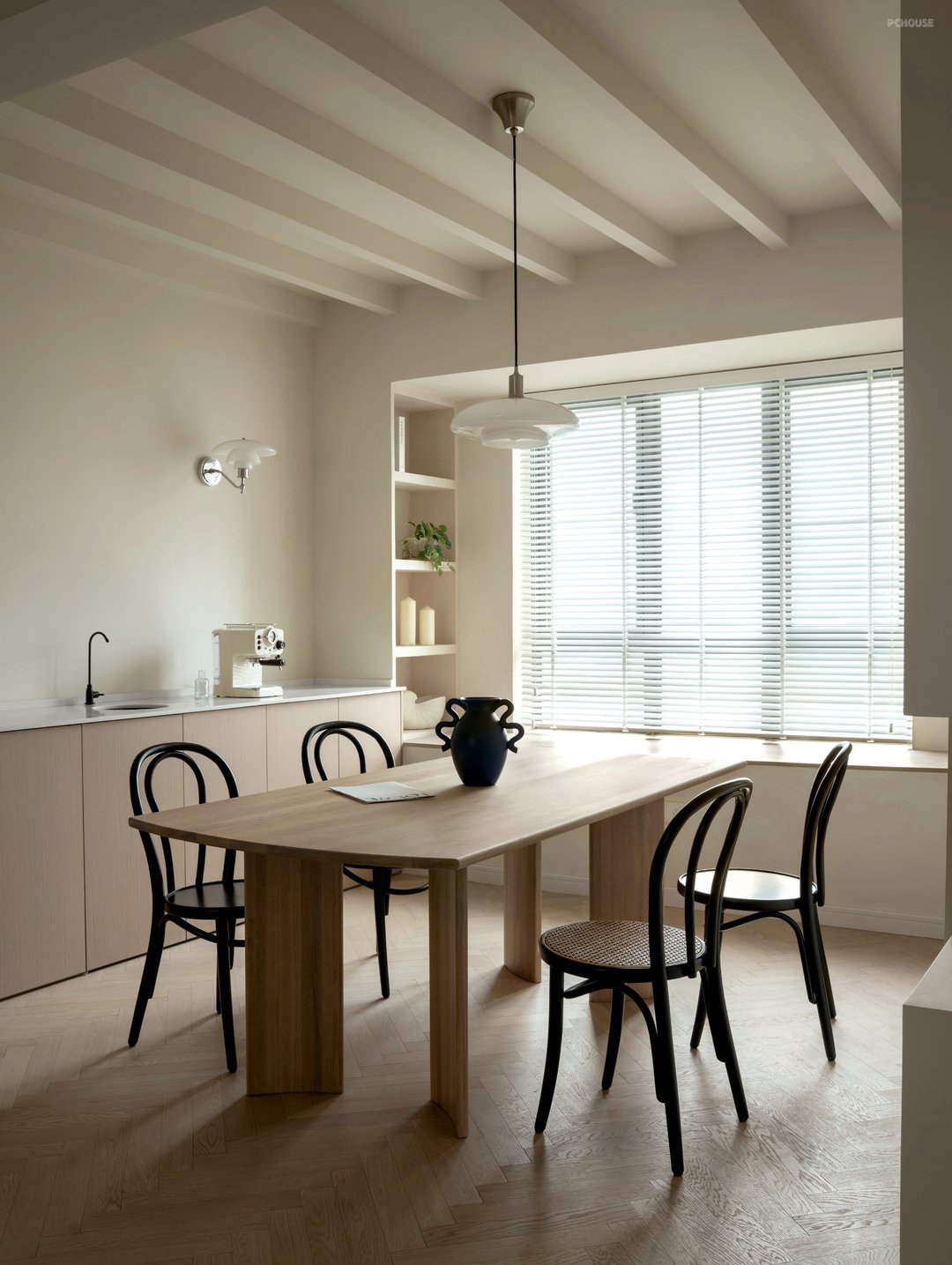 餐厅顶面的假梁构造设计,序列、建筑感造型与其他设计截然不同、空间感更加有层次,加上墙顶面统一奶油色系,又使得空间变得温柔、甜美,特别的氛围感让就餐、聚会、操作美的不一样。