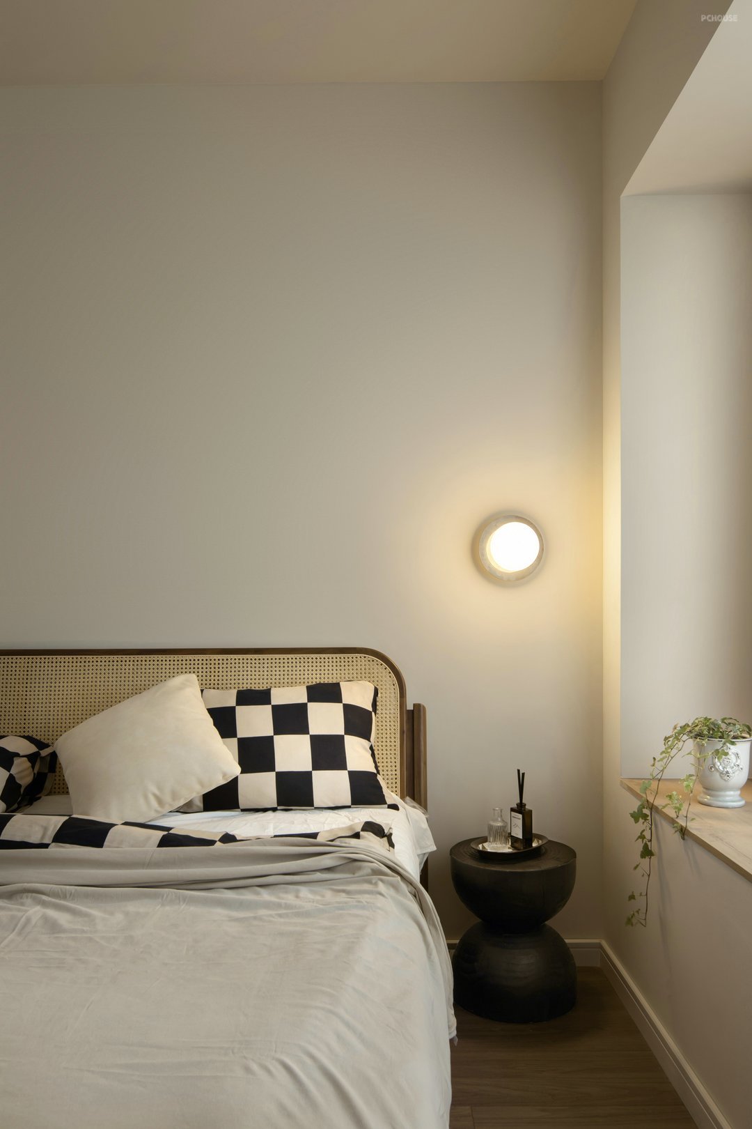 利用飘窗的角落做壁龛处理,再一次弱化飘窗的生硬视觉感。悬空隔断造型墙面设置不仅是对卧室和次卫生间的隐私考虑,也是屋主分享美食、拍照、打卡的构图元素。