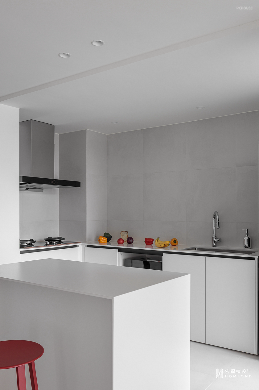 纳入一种全新形态的思考方式,舍弃传统用餐模式,利用岛台连接入户与开放式厨房。中岛成为空间中的核心部分,形成便捷的洄游动线,将聚力集合,既是储物空间也是操作台又是日常餐桌,亦是闲暇时,夜幕降临之后与两三好友品酒的吧台。