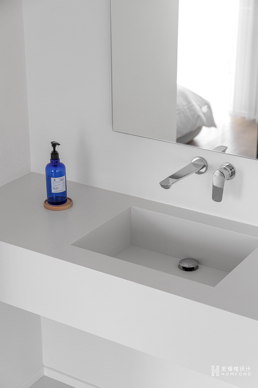 湿区隐于内部,包含如厕与淋浴功能。洗手台外放于公共空间,无过多修饰,保证最纯粹的视觉感官,为居住者提供现代、私密、愉悦的生活环境。