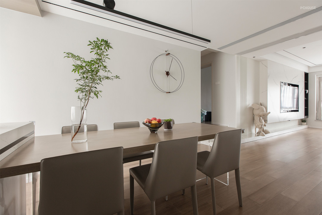 餐桌位置被调整之后,视线上通透开阔,预留出了足够的空间自由,还拥有餐厅背后通往中厨/冰箱的双动线。