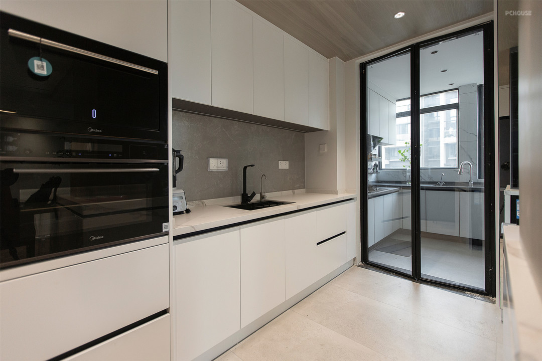 西厨补充了业主一家人喜欢烘焙和轻食的需求。U型格局搭配白色橱柜的中厨,将下厨功能更加细化,集收纳、操作于一体,质感十分纯净。