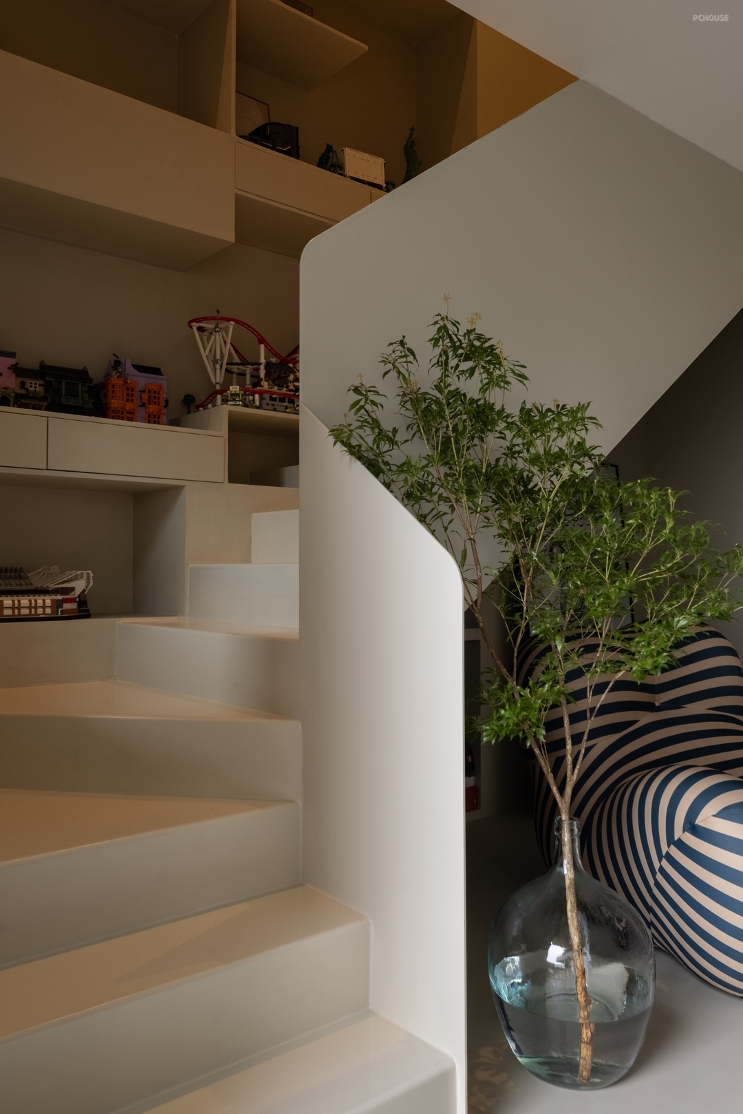 原始楼梯处封闭后,将空间封闭,用钢板设计不规则明格放置装饰品。