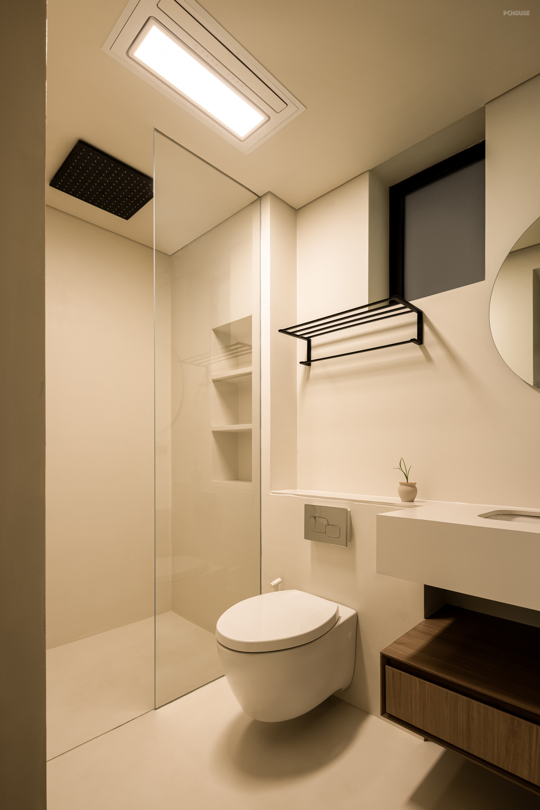 淋浴区墙面预埋手持花洒,顶面天幕花洒,满足不同沐浴习惯的用水需求。