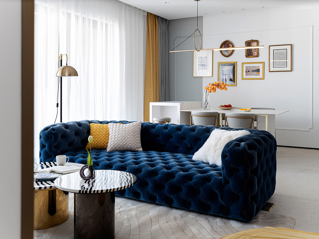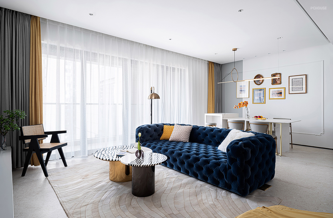 围绕深蓝色Chester moon沙发奠定的复古优雅基调;在这极简的空间内,地毯、茶几上简约流畅的线条,让空间富有灵动的魅力;