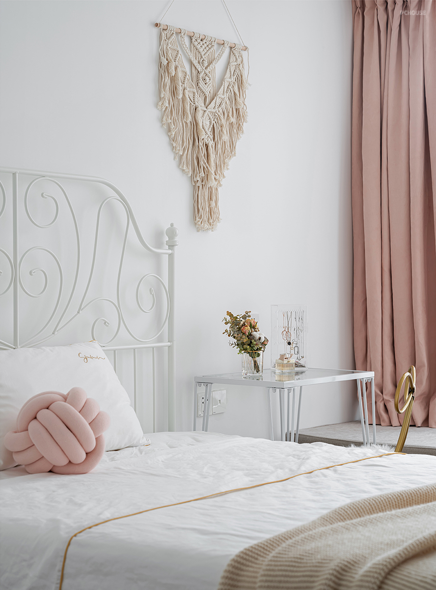 睡眠区以纯净白色调为基底,床具、书桌皆以黑色重点妆点出家的简练感。