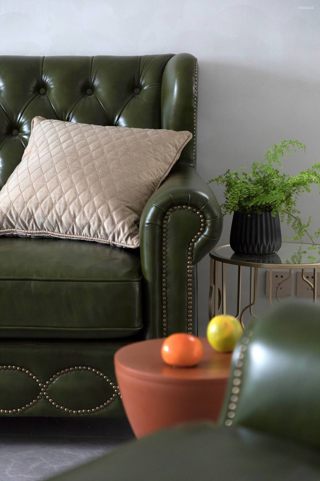 客厅软装搭配十分讲究,灯具、茶几与绿皮沙发的气质相互融为一体。