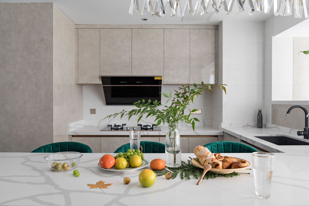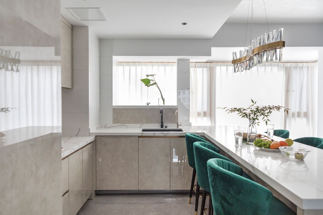 岛台使用的鱼肚白石材与电视背景墙的鱼肚白岩板相呼应,让空间有区分又有串联。