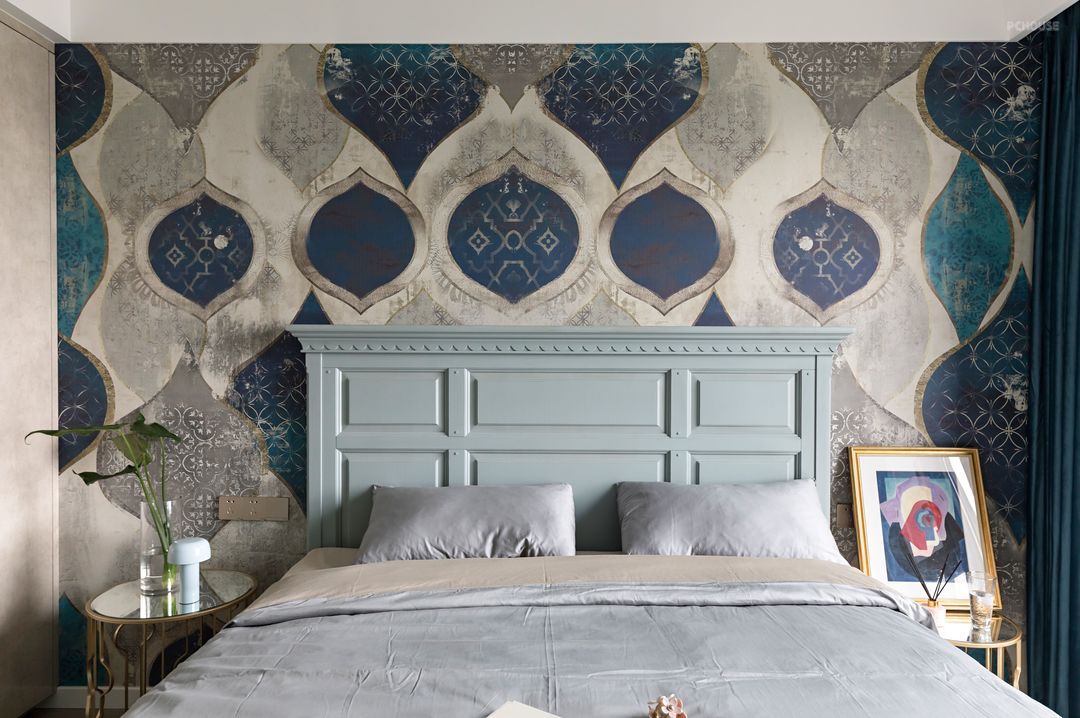 图案大气又不失美感的壁布与床体的湖蓝色形成碰撞,让屋子仿佛有了灵气,让人耳目一新。