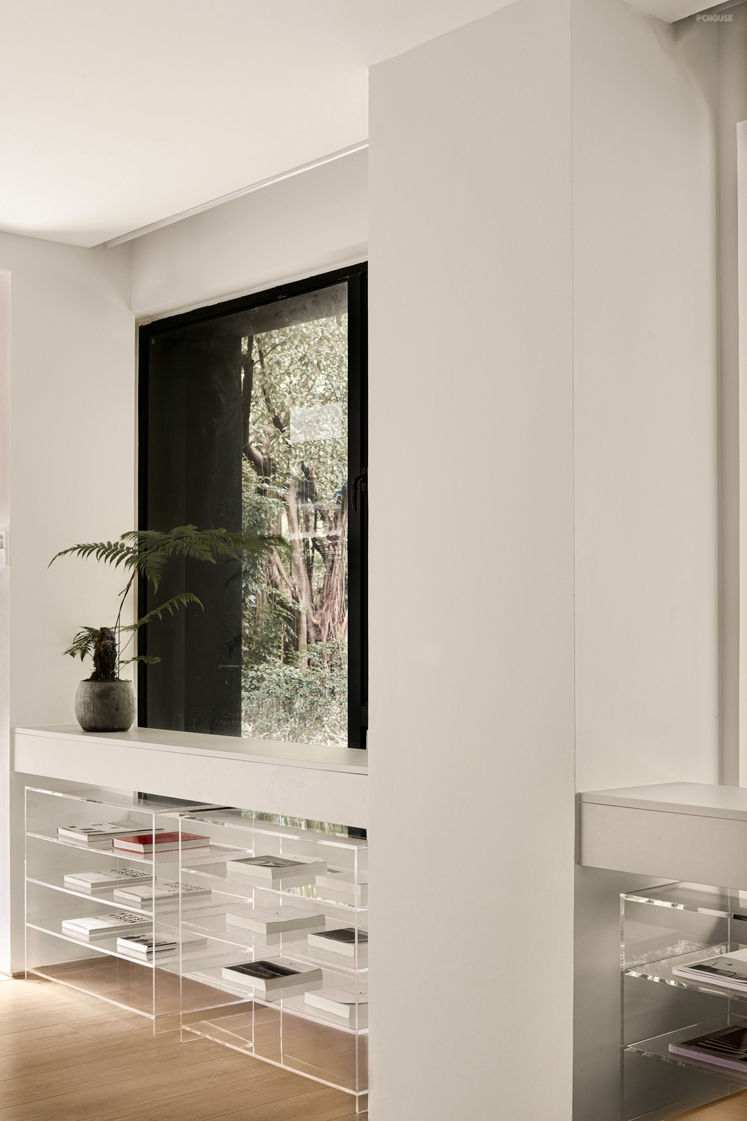 墙面设计与办公区一致的窗户,下面加装按压式柜体,台面可摆放艺术品或植物。